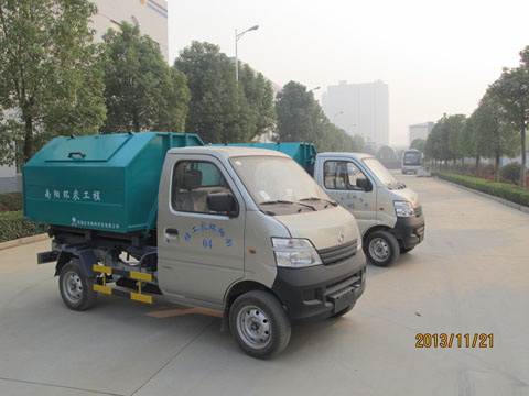 河南红宇有限公司生产的HYZ5020ZXX1型钩臂式垃圾车是在SC1022DB4长安牌二类底盘的基础上加装液压缸动力单元和钩臂而成。适用于垃圾收集和运输的专用汽车。HYZ5020ZXX1型钩臂式垃圾车装备有全封闭的钢质车厢(垃圾厢)和车厢起卸机构,实现垃圾的收集、装运和倾卸全过程的自动化。